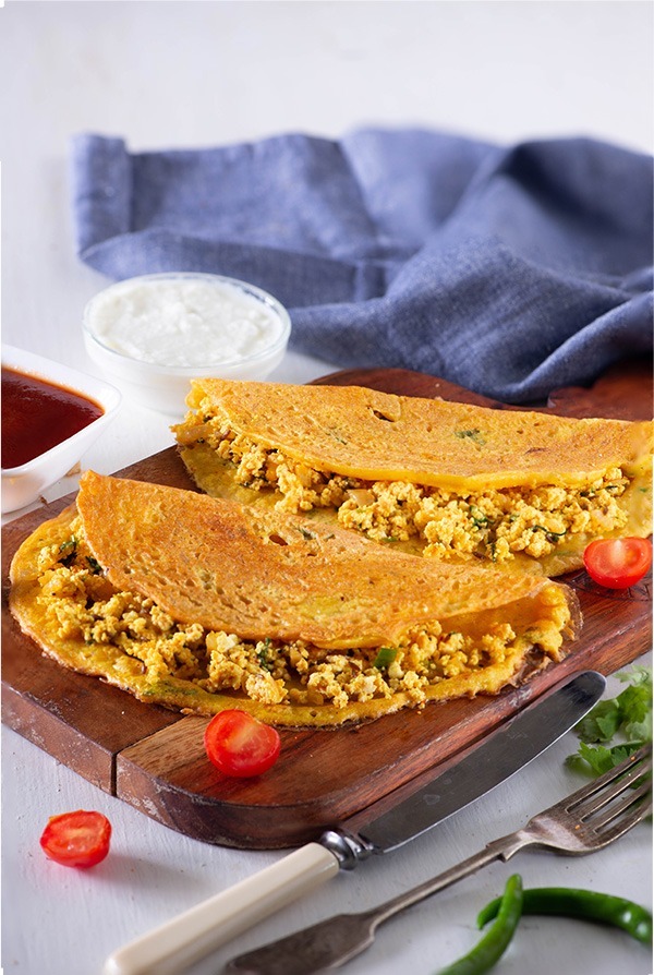 - Once pancakes are cool enough to handle, place a spoonful of Schezwan vegetable filling in the centre of each pancake and fold or roll them up.